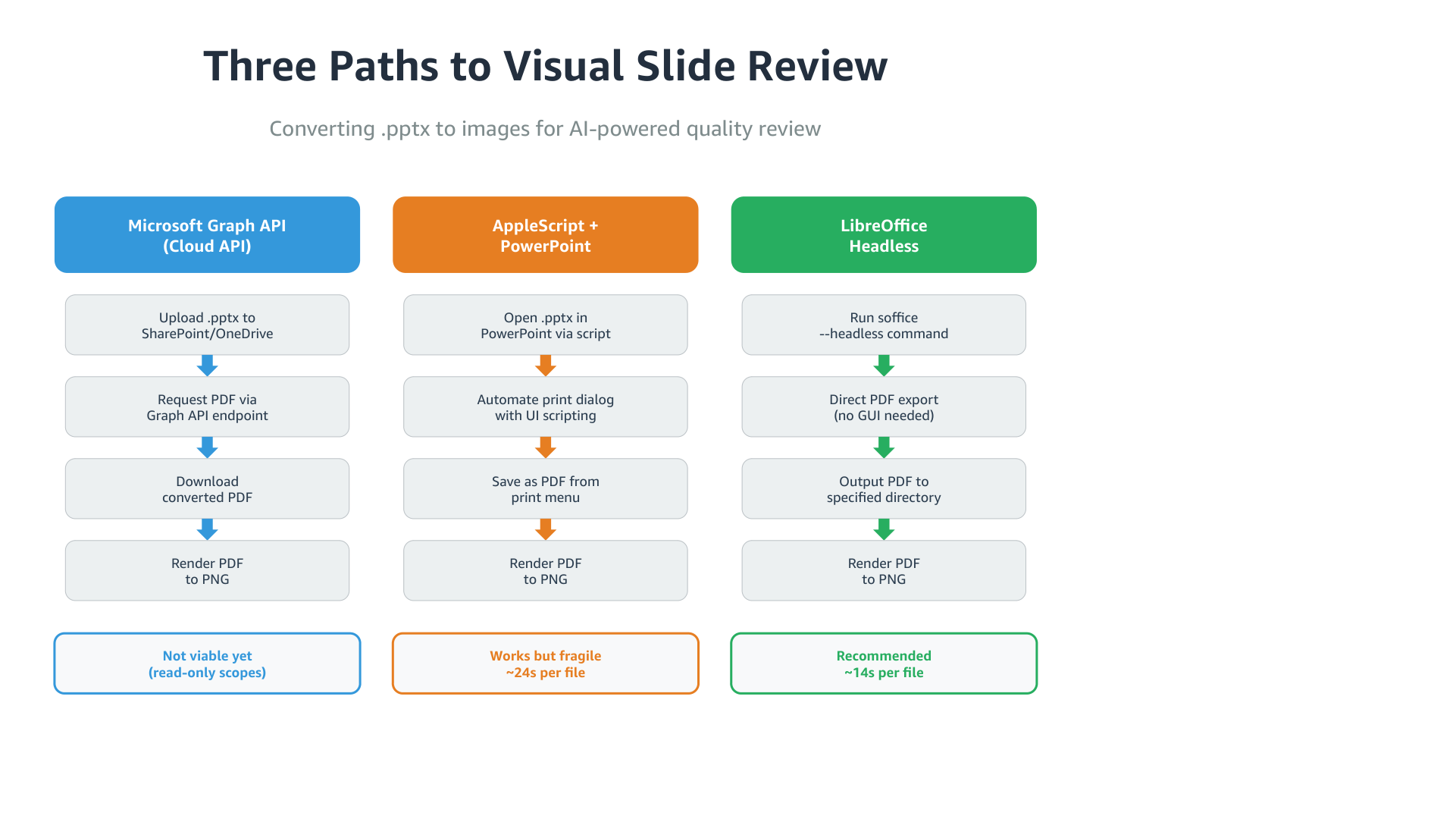 Microsoft’s Graph API can convert pptx to PDF server-side. Upload to OneDrive, request PDF back. Perfect fidelity, no local software. But it requires write scopes to upload files, and many corporate environments only have read access. Clean solution if your setup supports it, not an option for me yet.