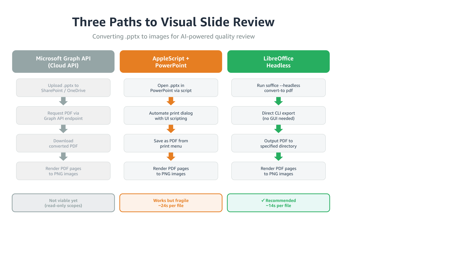 PowerPoint files are complex XML packages. You need a rendering engine that understands PowerPoint’s layout rules to turn them into something a model can see. I tried three approaches.