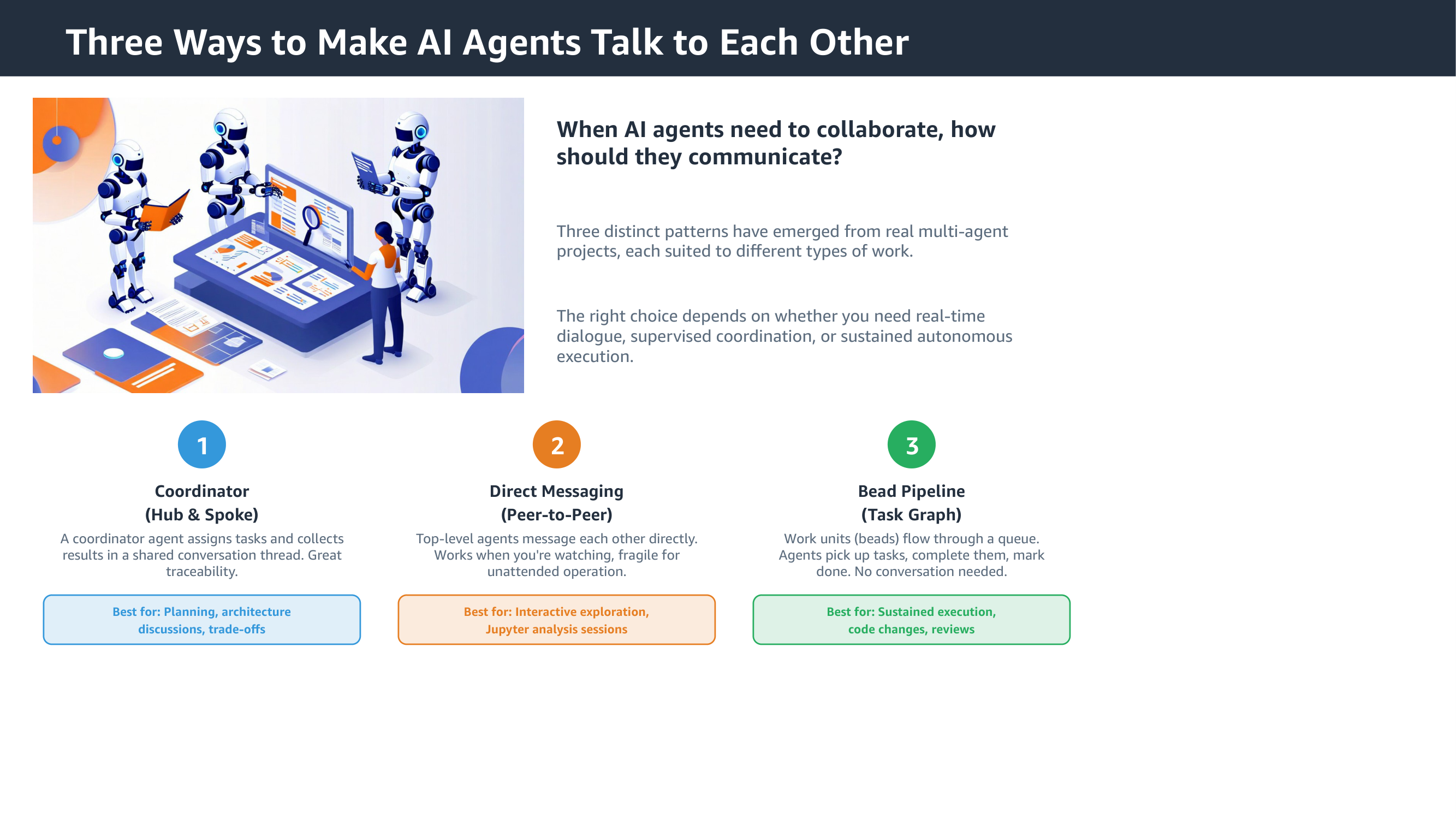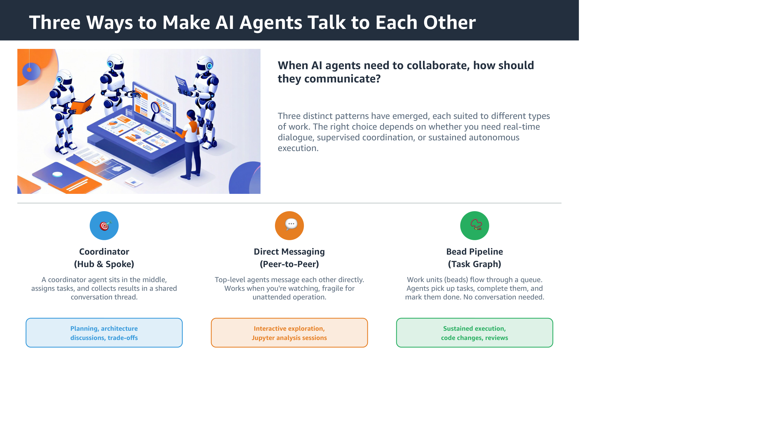On the patterns slide, the icons are generic emoji circles, and the “Best for” labels lack the prefix that makes them scannable.